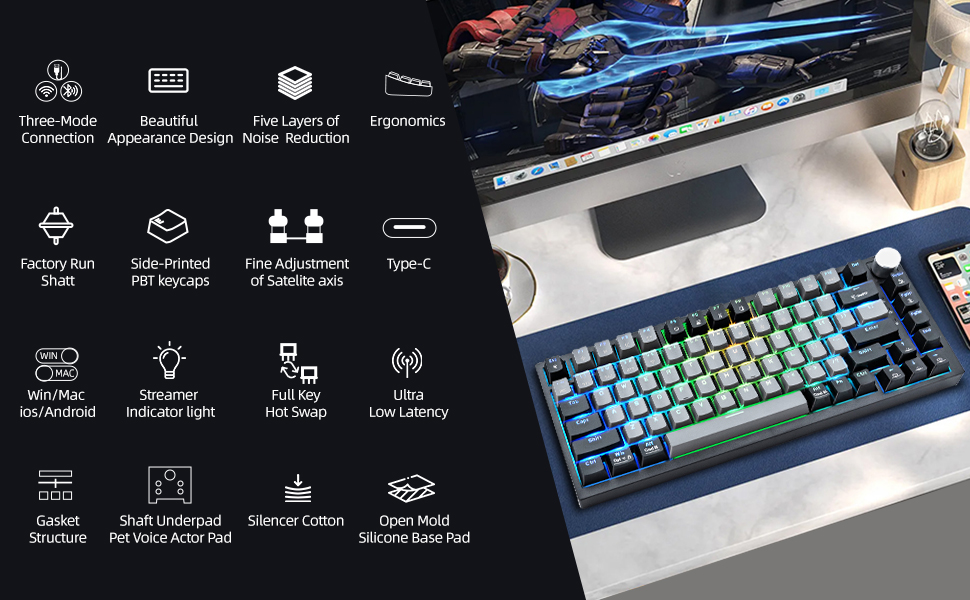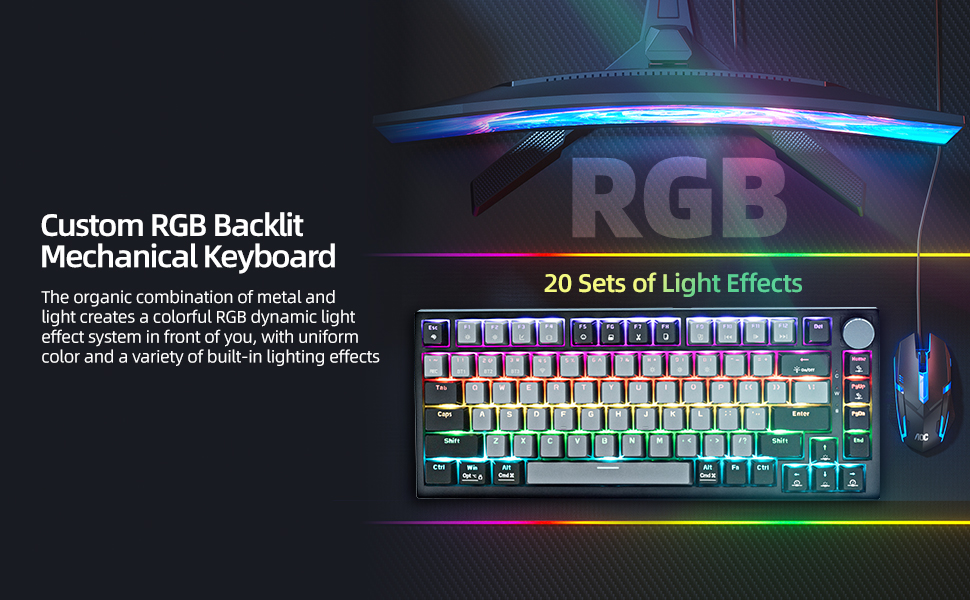 【🌈RGB Precision Lighting】Illuminate your workspace with the sophisticated RGB backlighting system, featuring 19 dynamic lighting effects and finely tuned brightness control from 0 to 100%. Crafted with light-transmitting PBT keycaps, the design ensures evenly diffused illumination while preserving crisp, laser-etched legends at any brightness. Compatible with Windows, Mac, and multiple gaming platforms, this keyboard transforms into a vibrant visual canvas with customizable effects.