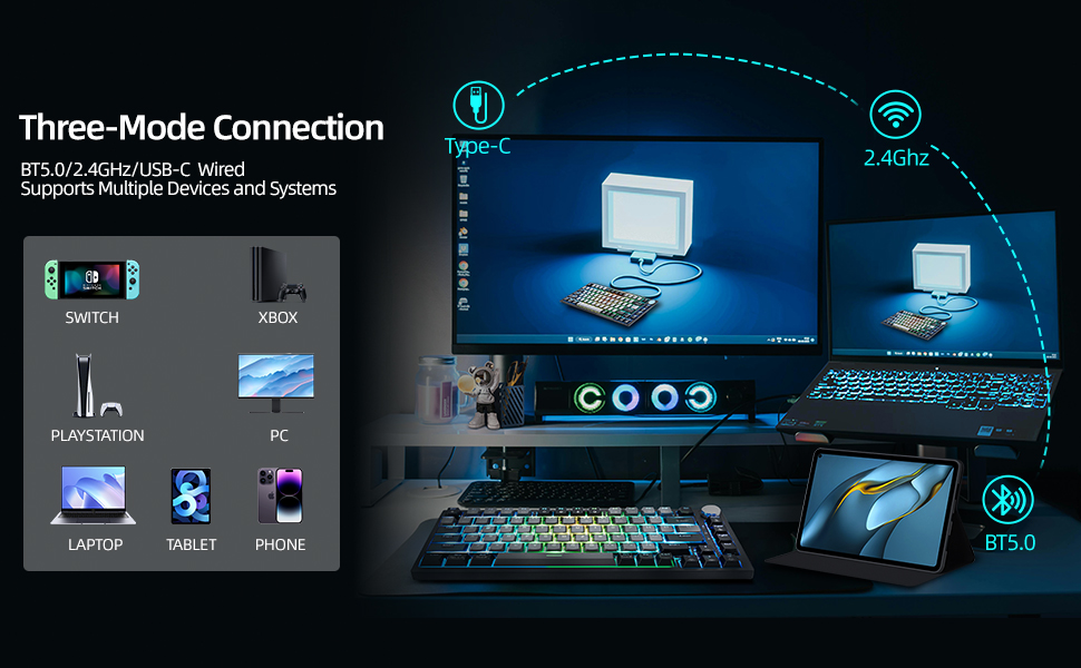 【🚀Tri-Mode Connectivity】Experience unparalleled versatility with the WJX mechanical keyboard, which integrates advanced Bluetooth 5.0, high-speed 2.4GHz wireless, and robust USB-C wired connectivity. Designed to interface seamlessly with a diverse range of devices—including PCs, laptops, tablets, smartphones and some game machines. Its reliable, high-performance operation ensures optimal functionality for gaming, professional tasks, and everyday computing needs, both at home and on the go.