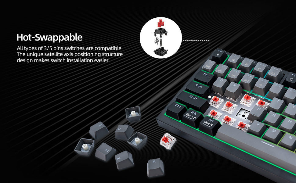 【🔧Hot-Swap Customization】Effortless hot-swap design, accommodating both 3-pin and 5-pin switch systems without the need for soldering. This innovative configuration empowers users—from novices to seasoned enthusiasts—to tailor their tactile experience with ease. Premium red switches deliver silky, responsive keystrokes accompanied by a distinct mechanical sound, ensuring rapid input and superior performance for intense gaming sessions and high-speed typing alike.