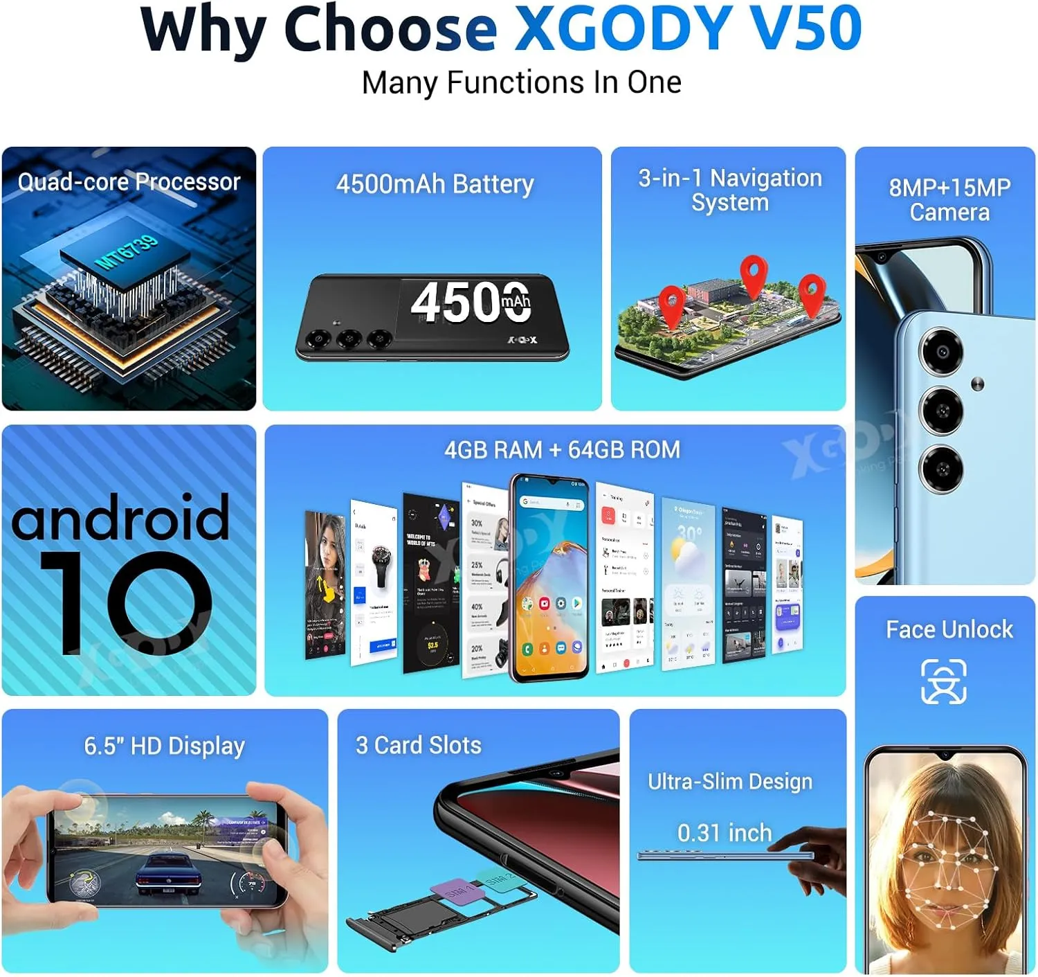【Compatible with T-Mobile】The Xgody V50 a unlocked smart phone is a 4G LTE android phone unlocked that works with T-Mobile networks and their MVNO networks. Please note that a SIM card is not included. For more information on compatibility with your carrier’s program, please check directly with them. (Not compatible with AT/T,Cricket, Verizon or with carrieries like Sprint and Boost Mobile)