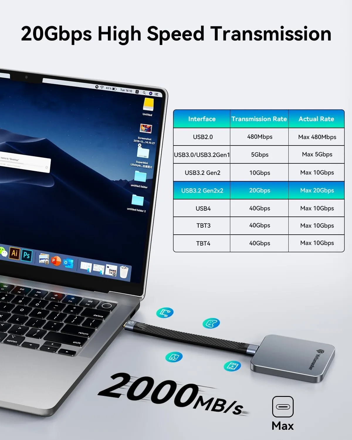 【High-Speed 2000MB/s Transfer】Yottamaster portable SSD offers a maximum transfer speed of up to 20Gbps, allowing you to transfer a 2GB file in just 1 second. This significantly reduces file transfer time and boosts work efficiency. Note: To achieve 20Gbps transfer speeds, you must use a USB 3.2 Gen2x2 interface and a 20 Gbps data cable. No other interface can reach a speed of 20 Gbps. Due to compatibility issues with the Thunderbolt interface on Apple devices, the maximum transfer speed when using an external SSD is limited to 10 Gbps.