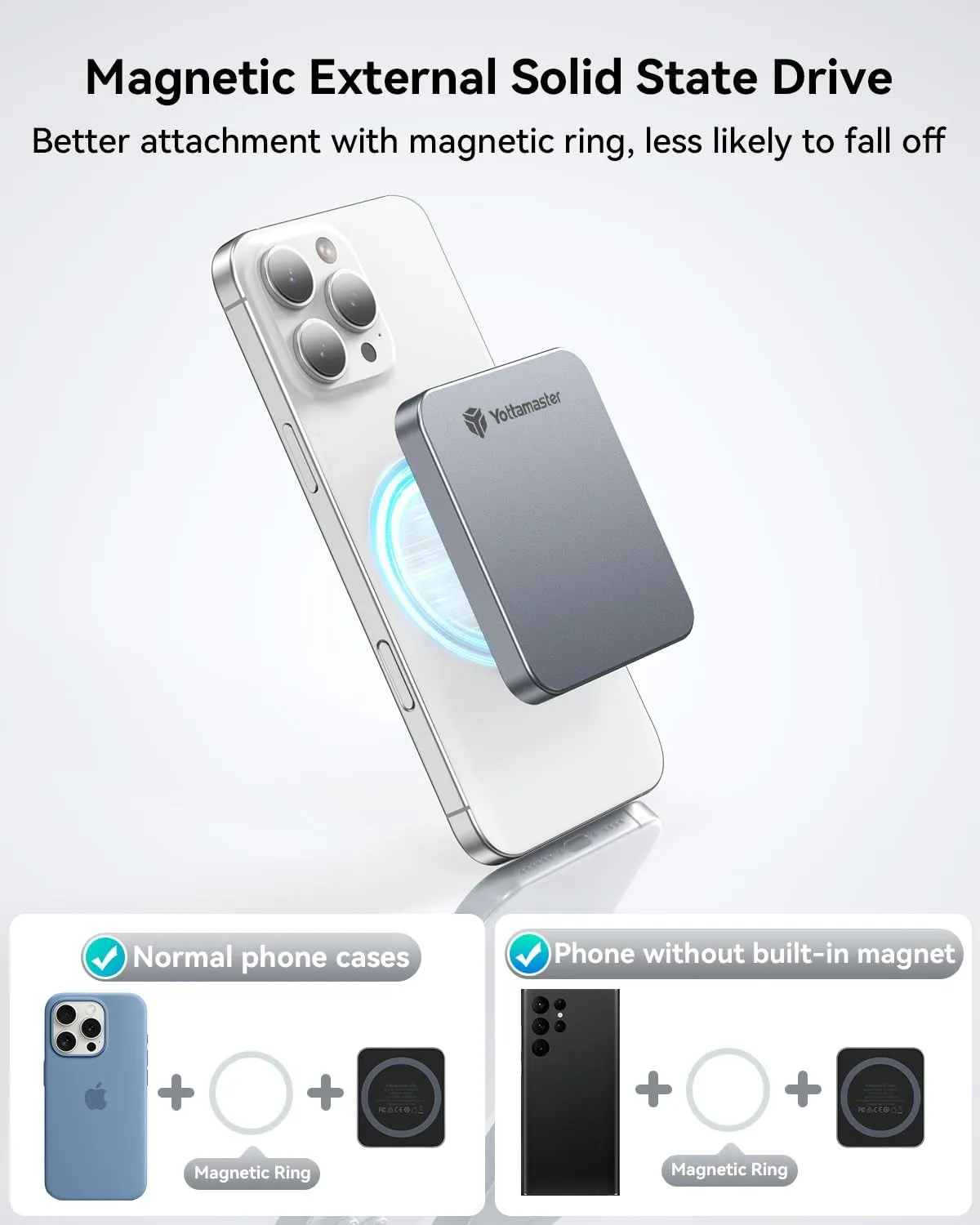 【Magnetic Design】Magnetic pssd 1tb can be directly attached to iPhones and phone cases with MagSafe support, and it also includes a magnetic ring for attachment to devices and cases without built-in magnets. This makes it the ideal choice for mobile photography enthusiasts, allowing you to store a large number of high-resolution photos and videos anytime, anywhere, combining portability and efficiency perfectly.!!Note: When using the PSSD with a phone case, it is recommended to use the included magnetic ring to prevent detachment due to insufficient magnetic force.